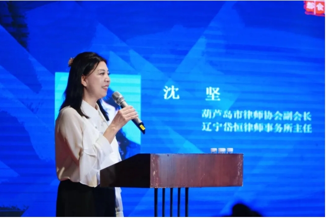 葫芦岛市律师协会副会长,辽宁岱恒律师事务所主任沈坚在后续致辞中表示,欢迎来自全国各地的嘉宾来葫芦岛参加研讨会。她介绍了葫芦岛律师行业情况,预祝本次大会圆满成功。