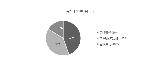 对法院认可依据鉴定不能进行归责的判决书中最终认定医院承担责任的判决书,依据最终判定的医疗机构责任比例进行细分统计:认定医院责任比例小于50%的、认定医院责任为100%的、认定医院责任在50%-100%(含50%)的,分三类进行统计,得到: