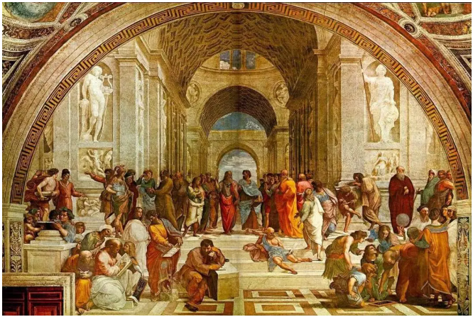 在这幅湿壁画中,拉斐尔将过去不同时代的哲学家、神学家以及多个学科领域的学者,以可甄别出“谁是谁”的精美生动特征,绘制在一起。拉斐尔把这些学者[4]分为不同的群组,分列在想象中的学术殿宇台阶之上。在画作的中央是最伟大的两位哲学家,位列左侧的是柏拉图,位列右侧的是亚里士多德。这两位哲学家被生活在不同时代的著名人物环绕,这些人物堪称柏拉图和亚里士多德分别创建的理想主义和经验主义哲学学派的追随者。对理想主义和经验主义的不同信奉,彰显了柏拉图和亚里士多德如何影响人类以后不同世代的思维生活。本文旨在揭示柏拉图和亚里士多德怎样对当代的法律理论产生影响。
