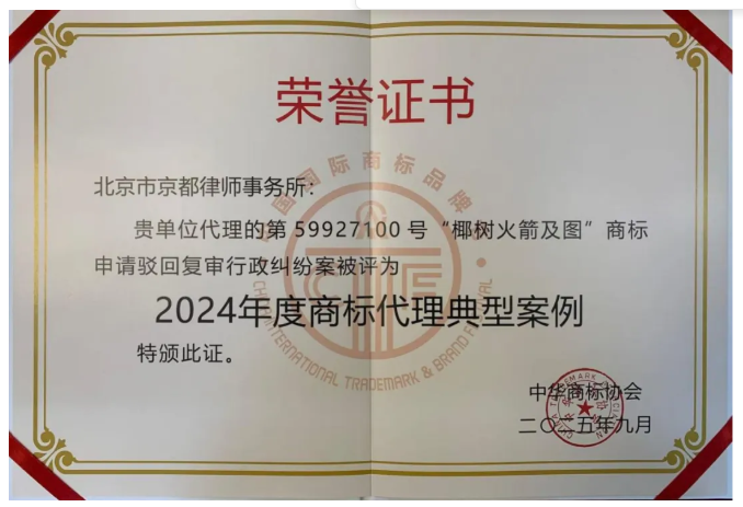 为了树立优秀典型案例标杆,充分发挥其示范指导效应,此次大会评选了35件“2024年度商标代理典型案例”,其中就包括了京都律师事务所代理的“椰树火箭及图”商标申请驳回复审行政纠纷案。