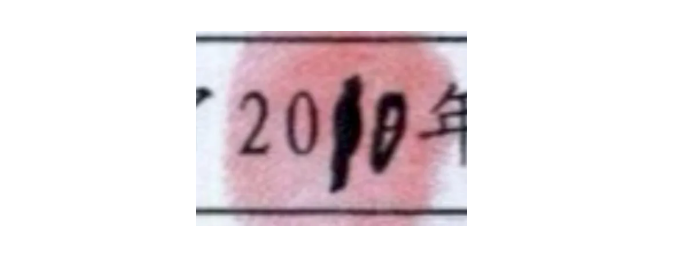 时间,修改的竟然是本案中最让人念念不能忘的时间。为什么要修改,修改的什么?必须要弄清楚。一般的修改是将原来的字用笔正常划掉、在旁边写上正确的、再捺指纹即可。可这个修改是直接涂画,几乎完全掩盖住原来的数字,加之覆盖在上面的艳指纹,使人难以再辨认。这时笔者想到了文检技术中一个简单的技巧——无限放大。于是就把它在电脑上一直放大,到大概十数倍的样子,终于能看清修改前的数字是“09”。如下图。