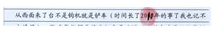笔录的修改处是白某正在叙述案发的过程:“这个时候从西面来了台不是钩机就是铲车(时间长了2010年的事了我也记不太清了),…”“2010”上被捺上指纹,其中的“10”是手写修改的。