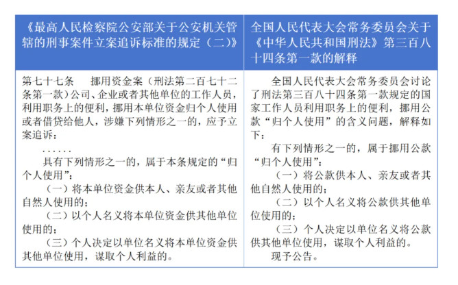 关于挪用资金罪中“归个人使用”的含义,《两高解释》中虽然未能释明,但另有具有司法解释性质的文件可供参考。2022年,最高人民检察院、公安部共同发布的《关于公安机关管辖的刑事案件立案追诉标准的规定(二)》(以下简称:《追诉标准》)第七十七条第二款规定:“具有下列情形之一的,属于本条规定的‘归个人使用’:(一)将本单位资金供本人、亲友或者其他自然人使用的;(二)以个人名义将本单位资金供其他单位使用的;(三)个人决定以单位名义将本单位资金供其他单位使用,谋取个人利益的。”值得注意的是,将《追诉标准》与全国人民代表大会常务委员会2002年发布的《关于〈中华人民共和国刑法〉第三百八十四条第一款的解释》(以下简称《立法解释》)相对比便可发现,最高人民检察院和公安部将挪用资金罪的“归个人使用”完全等同于挪用公款罪的“归个人使用”,并且完全按照《立法解释》制定了《追诉标准》相关条文(见表一)。
