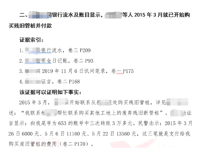 此时,我的指导老师循循善诱引导我梳理证据:开会时都有谁在?在哪里开的会?什么时候开始打假桩?距离开会多长时间?残旧管桩是从哪里来的?购买残旧管桩的费用是怎么支付的?谁打的假桩,劳务费是怎么支付的……