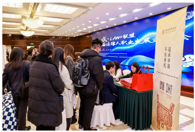 在交流环节,现场学生积极前往京都律师事务所等多家律所展台投递简历,京都律师事务所人力资源团队为应聘学生现场答疑解惑。