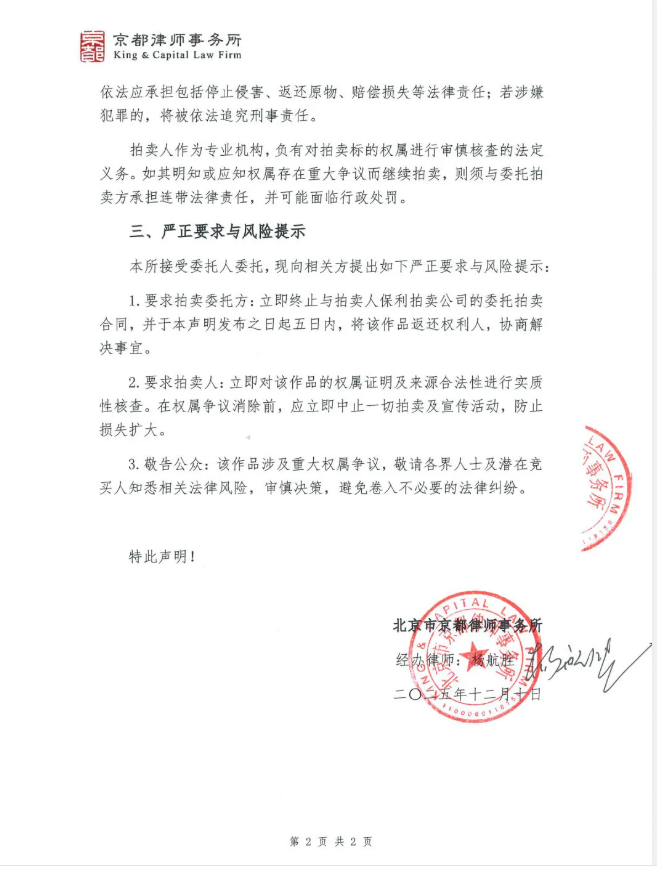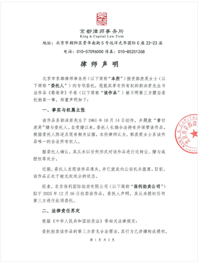 北京市京都律师事务所接受郭庶英女士的专项委托,委派杨航胜律师就其所有的郭沫若先生书法作品《蜀道奇》手卷(書付庶英)被不明第三方擅自委托拍卖一事,郑重发布律师声明。