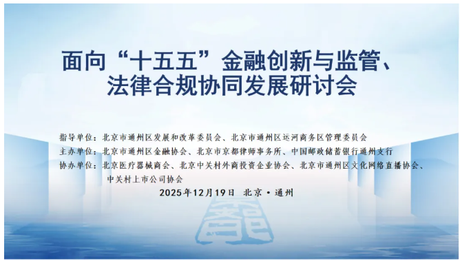 2025年12月19日下午,由北京市北京市京都律师事务所、通州区金融协会、邮储银行通州支行联合主办的“面向‘十五五’金融创新、监管与法律合规协同发展研讨会”在邮储银行北京分行九层会议室举行。来自政府、金融机构、产业组织、科技企业及法律界的近百名代表共聚一堂,围绕要素市场化配置改革、金融赋能产业、监管科技(RegTech)与法律合规等议题展开深度交流,为北京城市副中心建设全球财富管理中心与绿色金融中心贡献智慧。