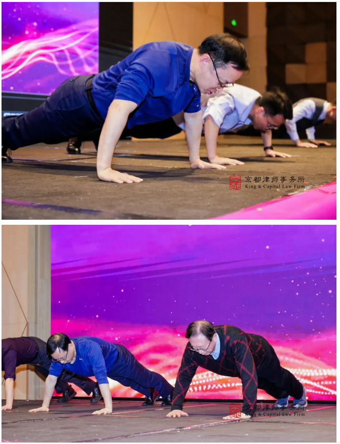 晚宴现场还延续了京都律所的传统运动项目——俯卧撑挑战。在京都律师事务所主任朱勇辉的号召下,各分所分别派出一位律师代表,率先完成50组挑战,随后又借京都30周年的特殊意义,再续20组。最终,在田文昌律师的带领下,大家共同向100组发起冲击。田文昌律师老当益壮,动作标准、轻松完成挑战,现场响起阵阵欢呼与掌声,充分展现了京都人拼搏进取、永不言弃的精神风貌。