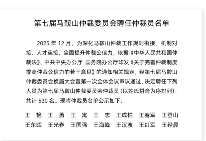 完整公示名单:第七届马鞍山仲裁委员会聘任仲裁员名单