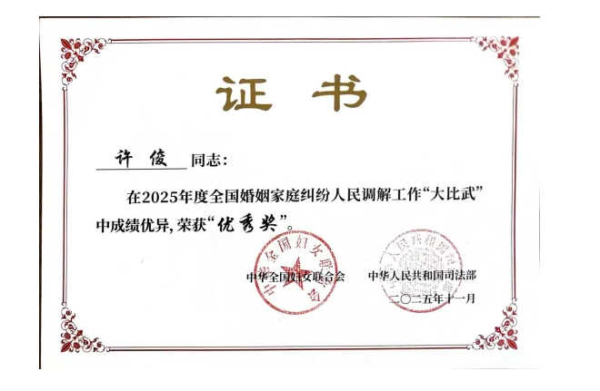 此次‘大比武’不仅是技能的比拼,更是初心的淬炼。”许俊律师表示,从全国优秀同行的实践中,她更深刻体会到“千家万户都好,国家才能好,民族才能好”的深意,也更加明晰新时代婚调工作者“守护家庭幸福、筑牢社会治理基石”的核心使命。入选全国婚姻家庭纠纷人民调解人才库,对她而言既是荣誉,更是沉甸甸的责任。