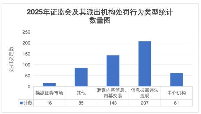 2025年,证券违法犯罪治理呈现出“惩、防、治并举”的新格局。一方面,监管机构延续2024年严监严管、强本强基的总基调,聚焦财务造假、内幕交易、操纵市场等突出违法类型,快、准、狠进行打击,既抓早、抓小、抓苗头,又打大、打恶、打重点。据不完全统计,截至2025年12月31日,证监会及其派出机构已作出行政处罚决定共计512项[1],相较于2024年的592项[2]虽略有下降,但仍保持高位运行态势,处罚信息披露违规207项,内幕交易、泄露内幕信息及利用未公开信息交易143项,操纵市场16项,中介机构违规61项,其他违规行为85项。另一方面,严打之外,监管机构加速推进治理重点向源头防控转移,通过完善分层分类的行为指引与规则体系,引导市场主体建立内生性自治合规体系,以源头防范为先导,以行为规范为核心,相较2024年,治理格局更趋纵深,逐渐形成“事后严厉惩戒”与“源头长效治理”双轮驱动、协同发力的全新态势。