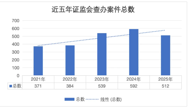 2025年全年,证监会及其派出机构作出行政处罚决定数量为512项。尽管处罚数量相较2023和2024年均有所下降,但仍处于近五年内处罚高位。这一方面表明2025年度监管逻辑持续深化,制度执行显著强化,另一方面也表明,对证券期货违法犯罪的执法导向趋精、趋细、趋实,目的是打击精准、完善细节,将各项规定、举措落到实处。