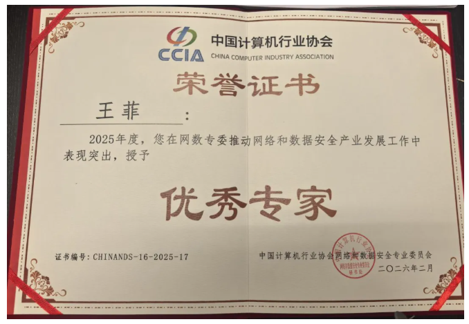 在颁奖环节,中国计算机行业协会网络和数据安全专业委员会对在2025年度推动网络和数据安全产业发展中表现突出的专家进行表彰。王菲律师凭借在网络安全与数据合规领域的深厚专业积累、丰富实践经验及对产业发展的积极推动,荣获“优秀专家”称号。