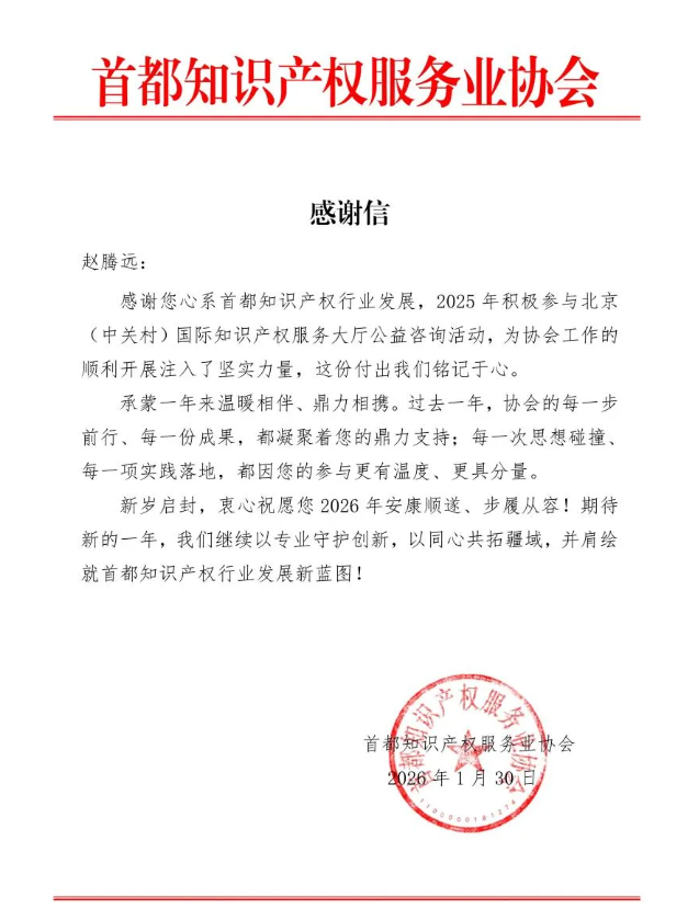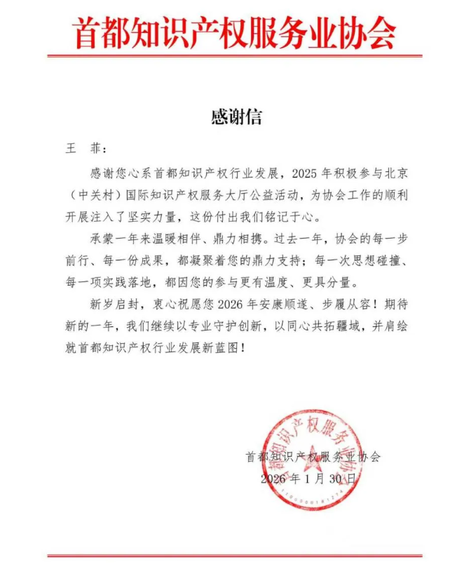 首都知识产权服务业协会在感谢信中特别提到,王菲、赵腾远两位律师的积极参与和无私奉献,为协会公益咨询工作的顺利推进注入了坚实力量,让公益服务既有专业深度,又有温度分量,有效助力了知识产权公益服务的落地见效,为推动我国知识产权服务业高质量发展贡献了重要力量。