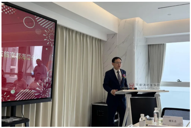 京都(海口)律师事务所主任杜宇上台汇报。杜宇结合当下人工智能行业的发展趋势,分享了对京都海口分所未来五年的规划与布局,强调将依托京都律师事务所31年来法律服务的丰富经验和良好口碑,整合优质法律资源,聚焦客户需求,紧扣海南自贸港定位,从专业化、团队化、国际化三维发力,深耕特色法律服务领域。