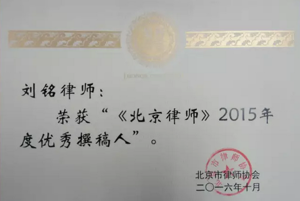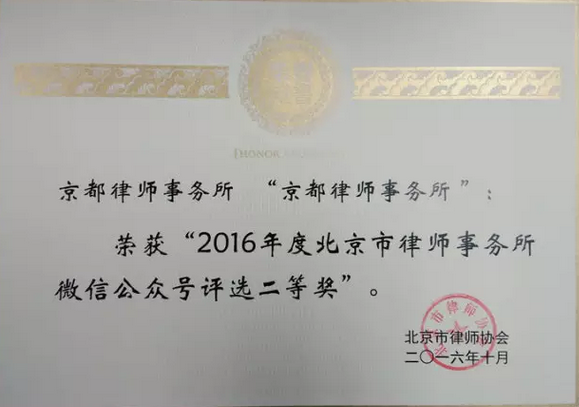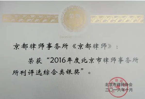 10月19日,北京市律师协会召开了“会刊优秀撰稿人、所刊及微信公众号评选颁奖座谈会”。京都律师事务所荣获三个奖项。其中《京都律师》荣获“2016年度北京市律师事务所所刊评选综合类银奖”,微信公众号“京都律师事务所”荣获“2016年度北京市律师事务所微信公众号评选二等奖”,京都律所高级合伙人刘铭律师荣获“《北京律师》2015年度优秀撰稿人”称号。