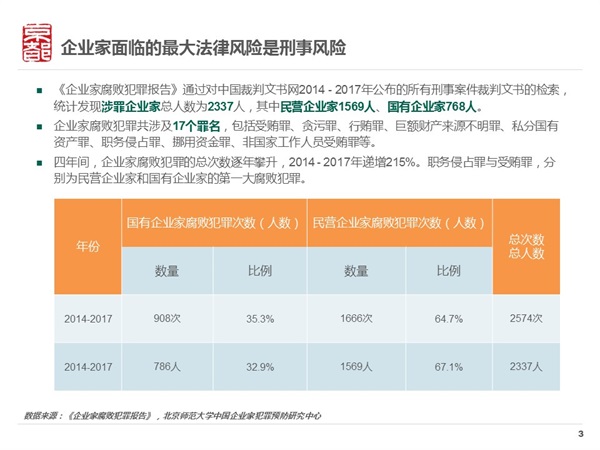 有这样一个报告,叫作《企业家犯罪研究报告》,我们先看一看这个报告,通过这样一组数字来了解一下现阶段企业家在经营过程中面临的刑事法律风险究竟有多大。