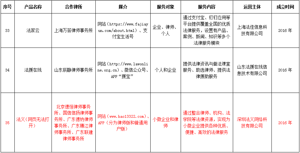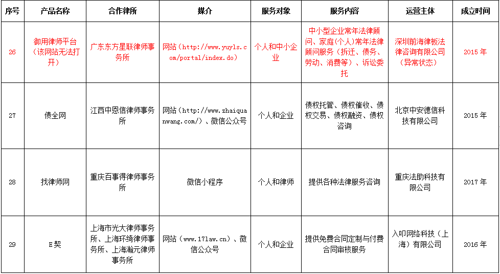 2.标注为红色的内容为网站、APP或公众号出现异常的创新法律科技产品。